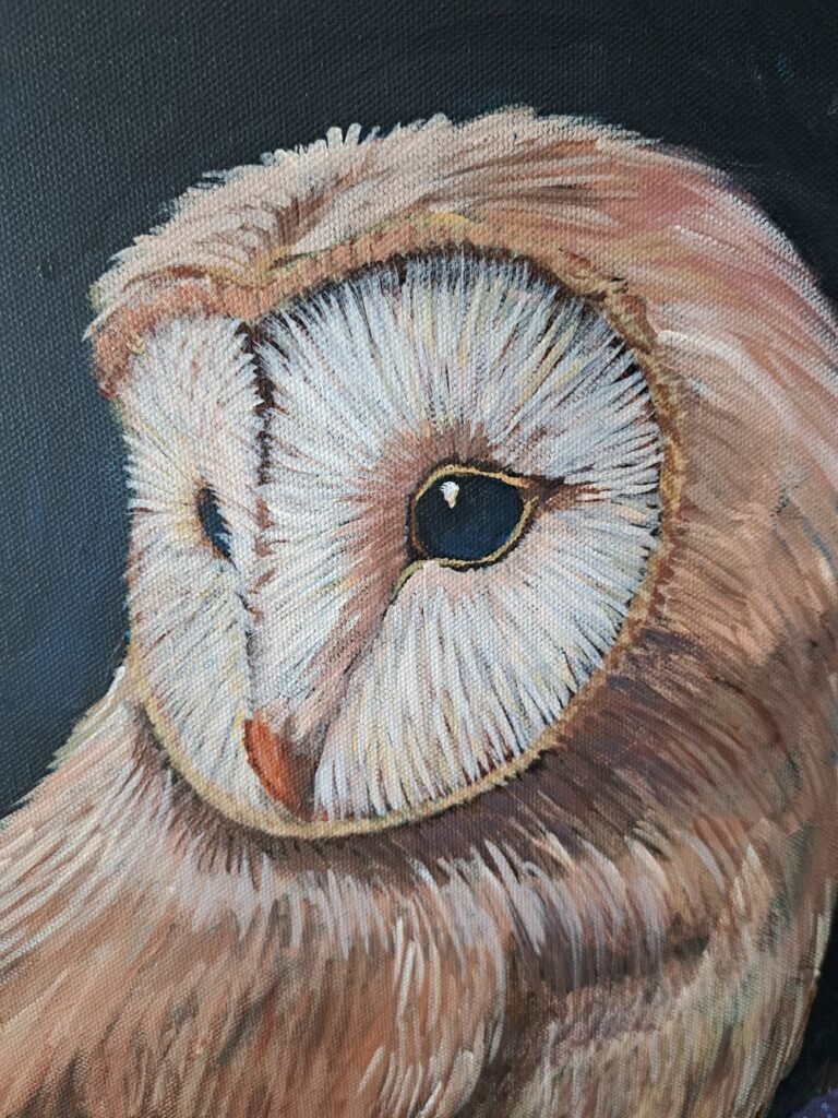Visually, the painting balances realism with expressive brushwork. Each feather is observed carefully, yet allowed to breathe with visible strokes and color shifts. This balance mirrors the message of the owl itself: clarity paired with mystery, precision paired with intuition.