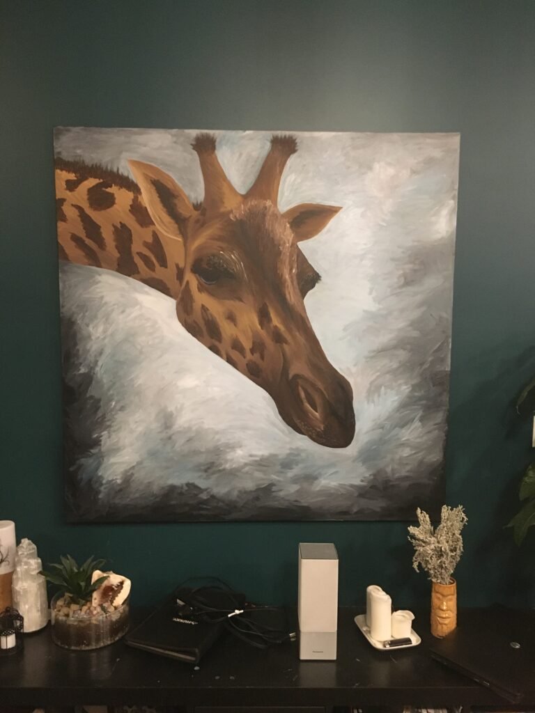 Creating art from lived experience carries memory, emotion, and presence that can’t be manufactured from reference images alone. There is a connection and understanding that makes the painting process so magical. Noah, a Masai giraffe, is one such experience that turned into a painting that was created in that magical flow state. It grew out of a connection I felt with this incredible animal and wanted to capture with my paints.